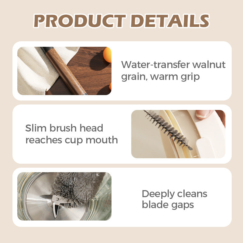 RENGÖRING AV DJUPA BLADSPALTER: Specialkonstruerade borst når trånga utrymmen runt mixerns blad och spår. Med bara några få drag avlägsnas rester och beläggningar helt, så att mixerns insida återfår ett rent, nyskickat utseende.