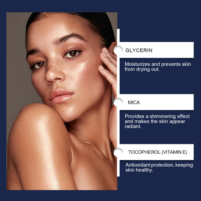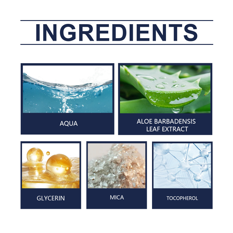 Produktingredienser: Vatten, glycerin, glimmer, vitamin E, extrakt av aloe barbadensis-blad