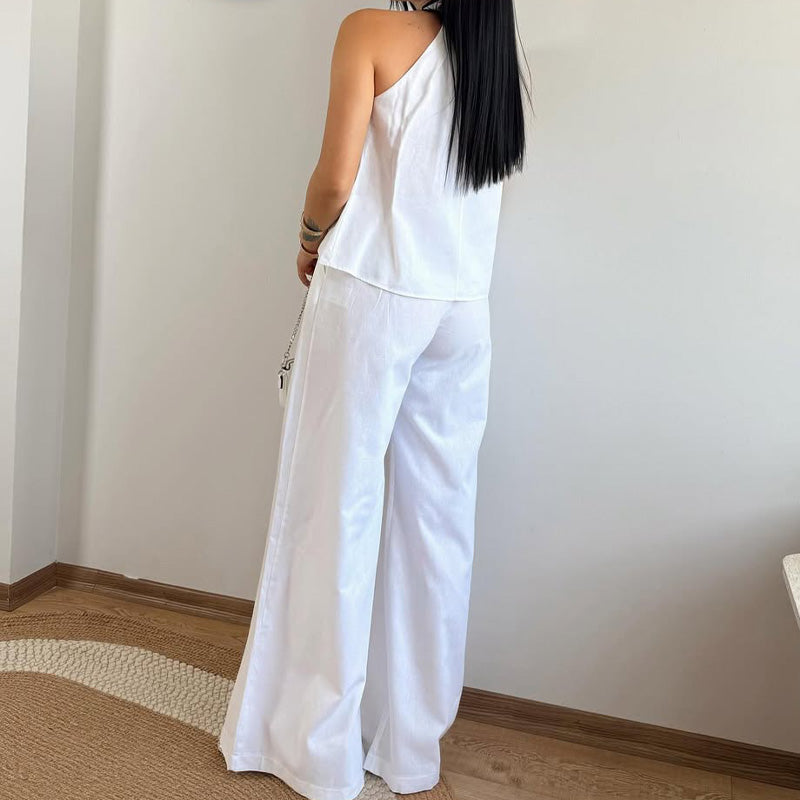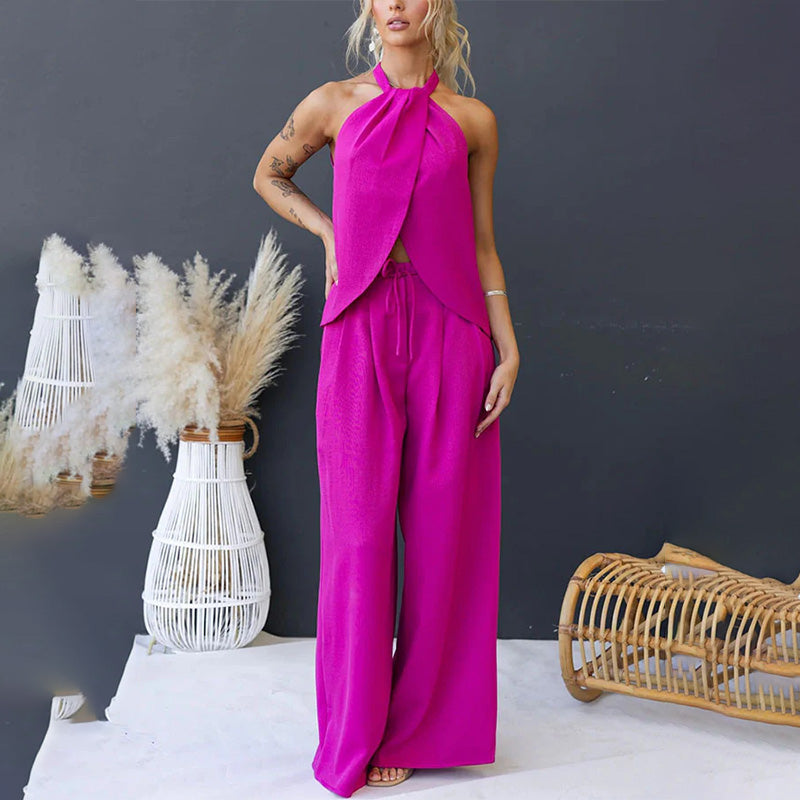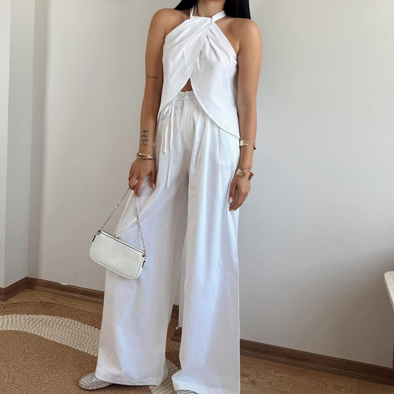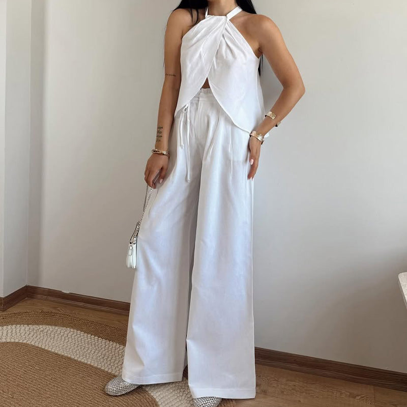 Avslappnad tvådelad plagg för kvinnor: halternecktopp och vida byxor