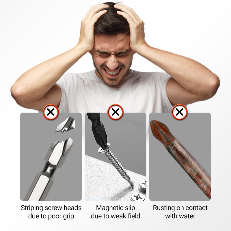đ©Â Supermagnetisk positionering: Varje bit Ă€r utrustad med en stark magnet i Ă€nden, vilket gör att du enkelt kan plocka upp och fixera skruvar utan att glida eller skala av. Detta garanterar ett sĂ€kert grepp och exakt placering varje gĂ„ng. Â