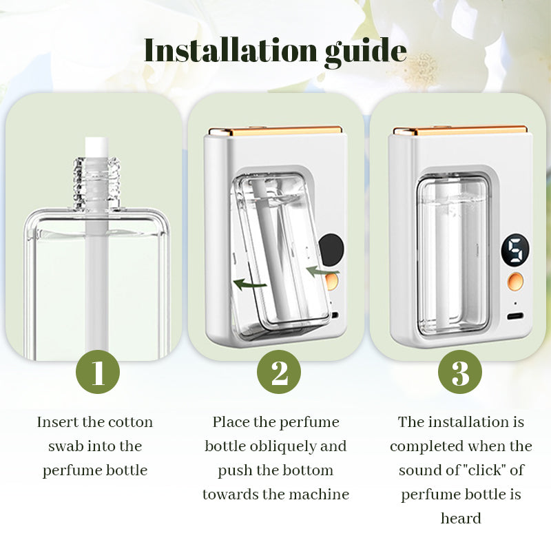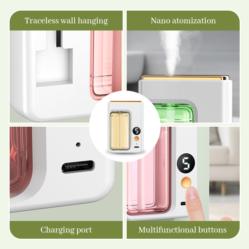 Ingen skada pÄ vÀggen, kompakt design och lÄngvarig doft för en förbÀttrad aromaterapiupplevelse. Laddning pÄ 2 timmar, rÀcker i 60 dagar!