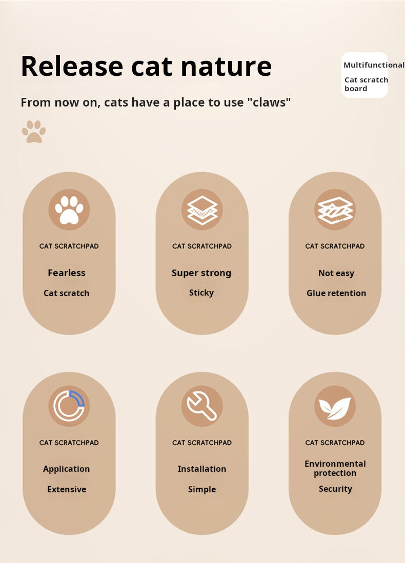 ENKEL VĂGGMONTERING - Den sjĂ€lvhĂ€ftande baksidan möjliggör snabb, verktygsfri fastsĂ€ttning pĂ„ slĂ€ta ytor. Dra bara av och klistra fast för att omedelbart skapa en klösyta för din katt. Ingen borrning eller extra hĂ„rdvara krĂ€vs - perfekt för hyresgĂ€ster eller personer som ofta flyttar om. Det starka hĂ€ftĂ€mnet hĂ„ller skraplĂ„dan sĂ€kert pĂ„ plats Ă€ven vid intensiv anvĂ€ndning.
