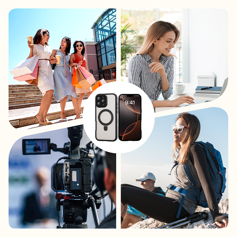 INBYGGD STATIV FĂR HANDSFREE-TITTA â Har  ett elegant, vikbart stativ pĂ„ baksidan som hĂ„ller telefonen i perfekt vinkel â perfekt för videosamtal, streaming eller surfning utan att hĂ„lla i enheten.