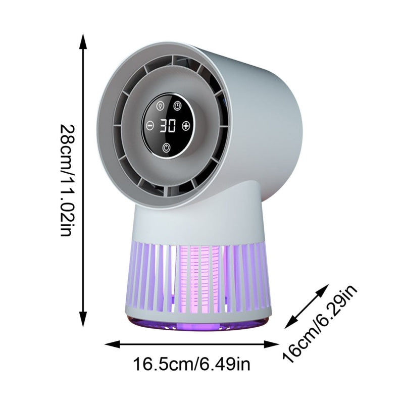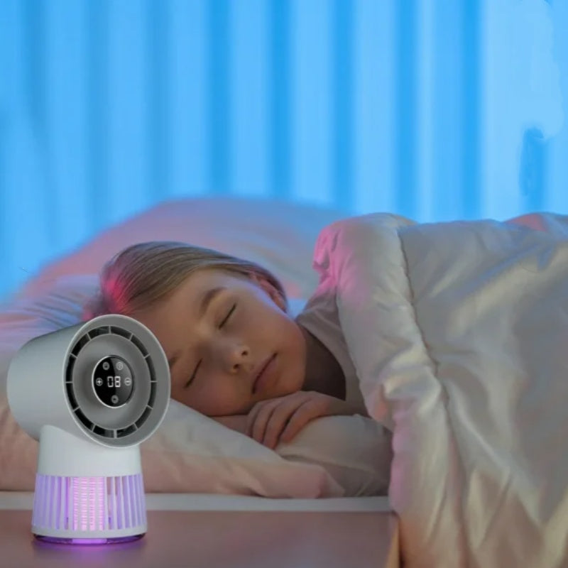 DUBBEL FUNKTION FÖR SOMMARBRUK: Kombinerar myggfångare och kylfläkt i en kompakt enhet. Håller ditt utrymme svalt samtidigt som det bibehåller en myggfri miljö – perfekt för avkoppling inomhus eller tyst arbetsyta.