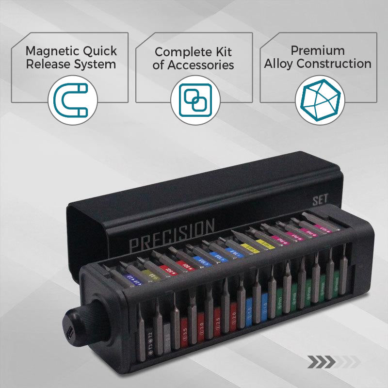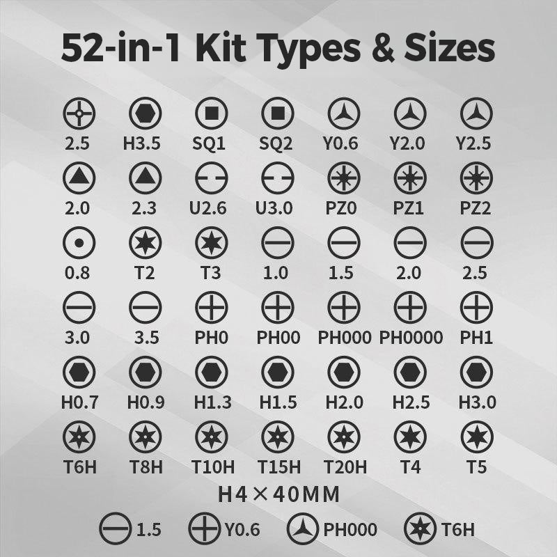 52-I-1 Mà NGSIDIGHET: Detta allt-i-ett-kit innehÄller precisionsbits som tÀcker allt frÄn ömtÄlig elektronik till tunga apparater. Oavsett om du reparerar smartphones, klockor, kameror eller till och med hushÄllsapparater, eliminerar detta set behovet av flera verktyg. Det organiserade urvalet sÀkerstÀller att du alltid har rÀtt bits för jobbet, vilket sparar tid och frustration.