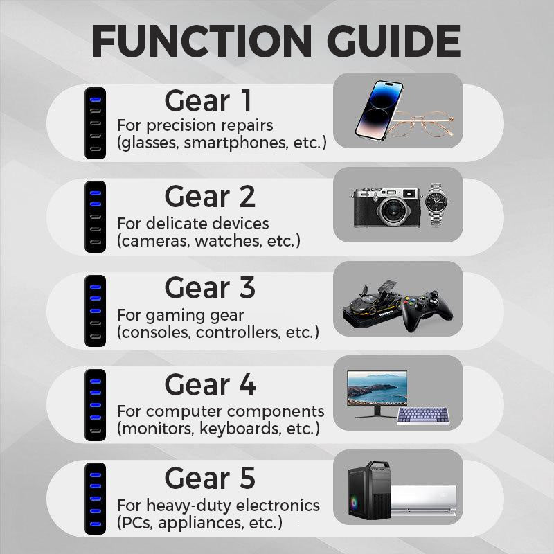 5-VĂGSLIGHETSADAPTERBARHET: Hastighet 1: Telefoner | Hastighet 2: Klockor, Kameror | Hastighet 3: Modeller, Spelkonsoler | Hastighet 4: BildskĂ€rmar, Tangentbord | Hastighet 5: Datorer, HushĂ„llsapparater. Justerbart vridmoment sĂ€kerstĂ€ller perfekt hantering för alla projekt.