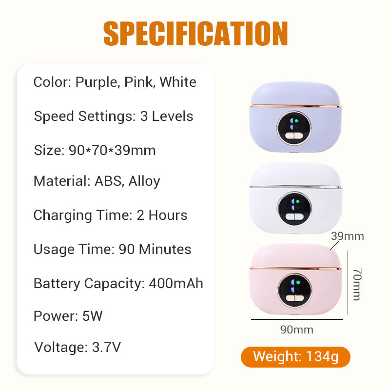 KONTROLL MED TRE HASTIGHETER: Har tre justerbara hastighetsinstÀllningar för att passa olika nageltyper och tjocklekar. Detta gör att du kan uppnÄ en slÀt och ren finish pÄ bÄde mjuka och hÄrda naglar, vilket ger en bekvÀm och effektiv manikyrupplevelse.