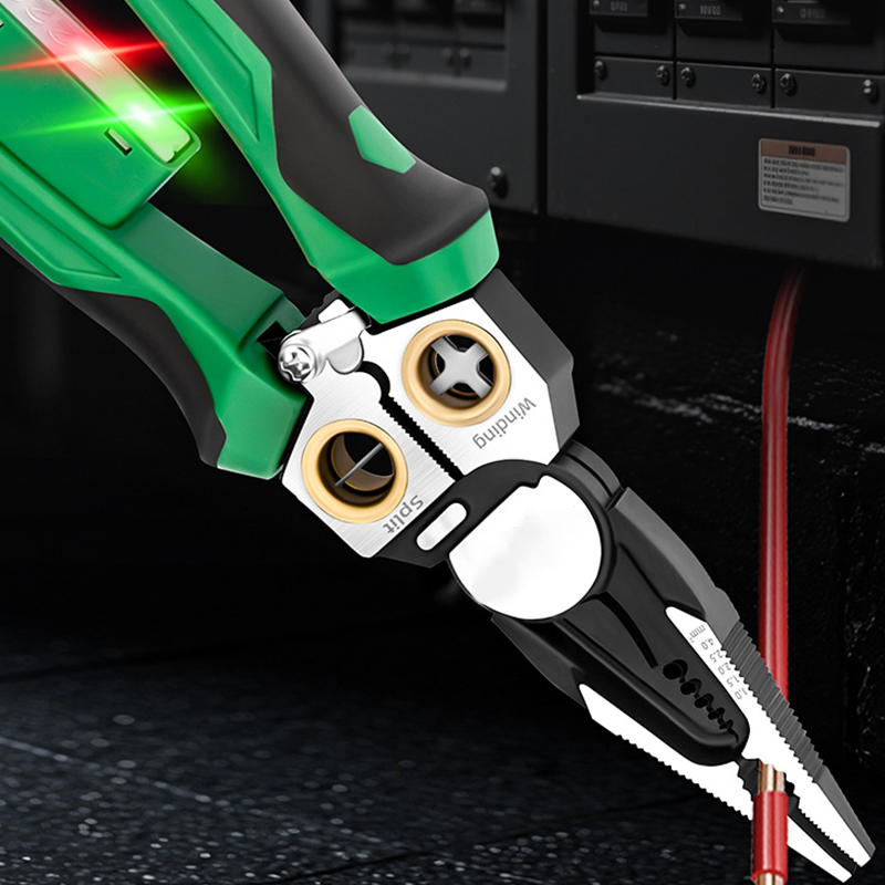 6-i-1 Funktionalitet: Kombinerar trÄdskÀrning, strippning, splittring, delning, gripande och spÀnningstestning (12-220V) i ett kompakt verktyg. Precisionsmarken med hög kolhaltiga stÄlblad gör rena snitt pÄ koppar-/aluminiumtrÄdar, medan den integrerade trÄdavskiljaren snabbt delar ihop parade kablar utan skador. Eliminerar behovet av att bÀra flera verktyg.