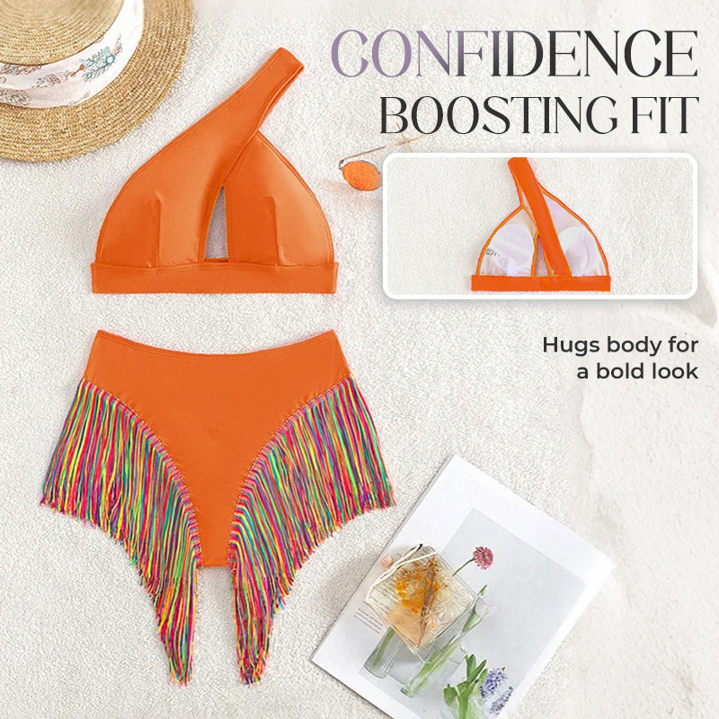 CHIC OCH SJÄLVSÄKER LOOK – Den eleganta enaxlade skärningen, fransarna i fållen och den åtsittande passformen skapar tillsammans ett djärvt och självsäkert badklädesval. Kliv ut med stil och känn dig som bäst varje gång du bär den.