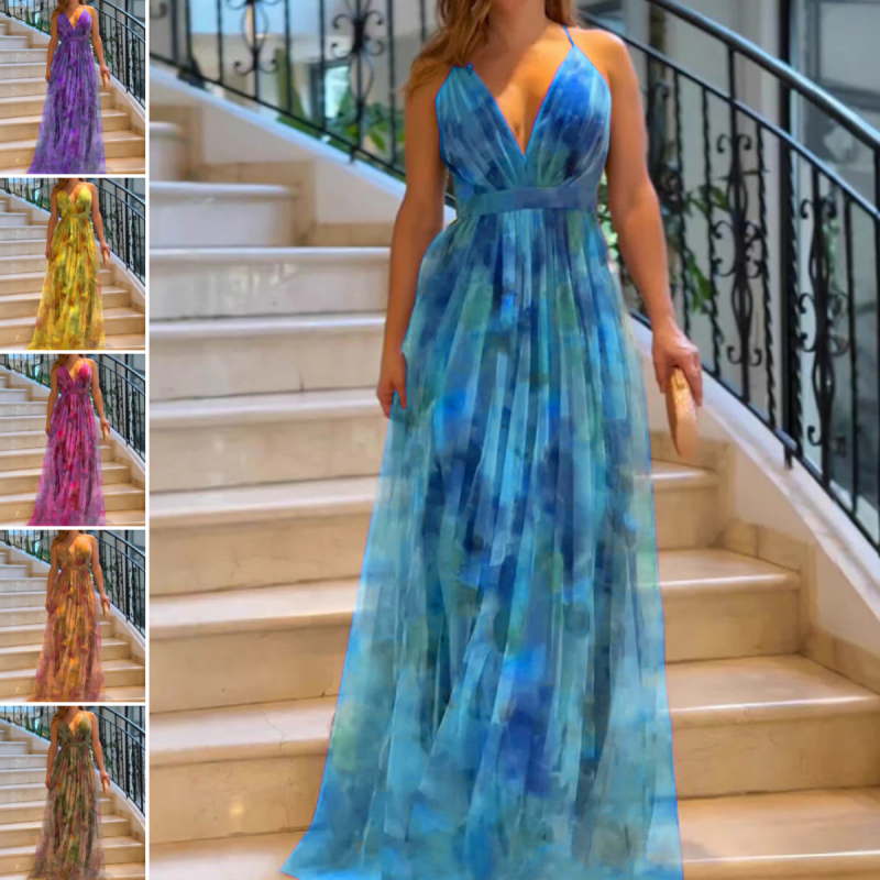 Paketet innehåller: 1 * Elegant tryck för kvinnor V-hals Backless Maxiklänning